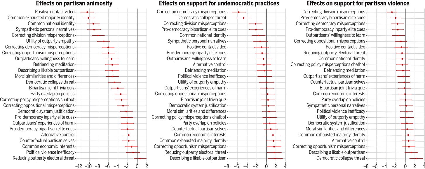 Many simple interventions meaningfully reduce partisan animosity (Voelkel et al. 2024).